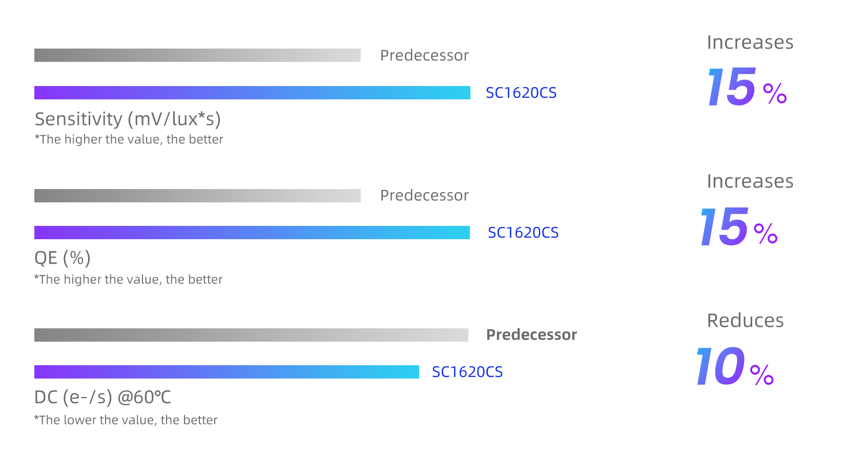 SC1620CS adopts innovative BSI pixel isolation and chip surface treatment technologies, which can effectively reduce Dark Current (DC) and White Pixel (WP), and greatly improve the image quality under high temperature conditions. Compared with similar products in the industry, its Dark Current (DC) has a reduction by lower than 10% at temperature of 60°C, which provides stable and clean images even at high temperatures or in long-term use of smartphones.