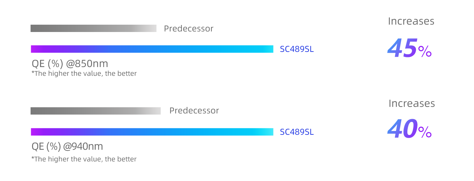 Developed upon SmartSens’ new Lightbox IR®-2 technology, through optimizing wafer epitaxy and Backside Deep Trench Isolation (BDTI) process, SC489SL achieves Near-Infrared (NIR) enhancement. As the first high-performance BSI product equipped with Lightbox IR®-2 technology, compared with its predecessor, SC489SL has a 45% increase in peak Quantum Efficiency (QE) at the 850nm wavelength and a 40% increase in peak Quantum Efficiency (QE) at the 940nm wavelength. Near-Infrared (NIR) enhancement of SC489SL helps the camera effectively expand the viewing range under dual infrared lights, achieving clear imaging at the distance of 120 meters, thus providing reliable support for outdoor long-distance security applications at night.
